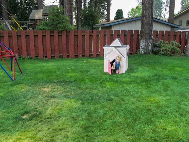 I finally got these pictures off of my camera. The kids and I gave their cardboard house a makeover, and it was a blast watching paint fly!
